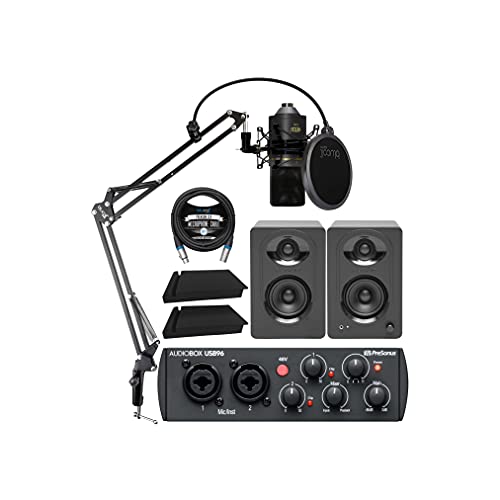 Details: PreSonus AudioBox USB 96 25th Anniversary Audio InterfaceThe black PreSonus AudioBox USB 96 offers 2 combo mic/instrument inputs with quiet preamps and +48V phantom power. You can plug in 2 condenser mics and record on 2 separate channels. Each channel has LED clip indicators and 0-35dB mic gain range. This audio interface also provides a Mixer Control knob for blending the input signal with your PC's playback stream. Want more? Don't forget to register your Audiobox USB 96 at PreSonus and get access to the complimentary Studio One Artist DAW!TECHNICAL SPECS:Compatible with: Windows, MacA/D Resolution: 24bit/96kHzPreamps: 2 Mic Preamps with +48V Phantom PowerFrequency Range: 20Hz-20kHzDSP/Effects: 20 FX Plug-InsPower Source: USB Bus PowerAlso Comes With:MXL 770 Condenser Microphone (Black)The MXL 770 Microphone features a FET preamp and transformerless balanced output giving a wide 30Hz-20kHz frequency response. It has a 6dB/Octave High-Pass Filter that accurately reproduces solid sounds at low and high frequencies. The cardioid mic has a -10dB Pre-Attenuation Switch and can handle up to 137dB SPL. It's perfect for recording vocals, keyboards, and string instruments.NOTE: This is a condenser mic and requires 48V phantom power to operate.Samson MediaOne M30 Studio MonitorsThe Samson MediaOne M30 is a pair of 10W (RMS) Class-AB amplifiers with a 3" copolymer woofer and 3/4" silk-dome tweeter. The compact multimedia speaker system features one active and one passive speaker. It's ideal to use in for music playback, home production, gaming, and video applications. You get an exceptional bass response (+5dB at 150Hz Bass Boost) and crystal clear high-ends with M30.Get this bundle today and receive these Blucoil exclusives:30" Long, 360° Rotatable Mic Boom Arm with Pop Filter2-Pack of Acoustic Isolation Pads10-Foot Balanced XLR Cable