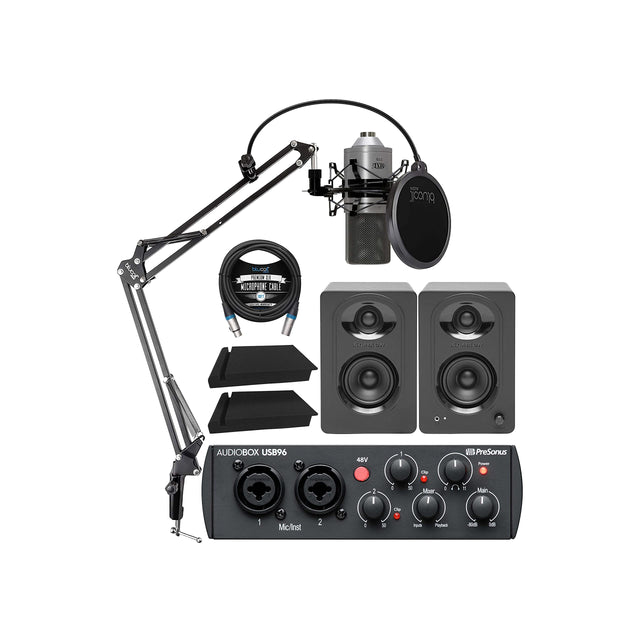 Details: PreSonus AudioBox USB 96 25th Anniversary Audio Interface The black PreSonus AudioBox USB 96 offers 2 combo mic/instrument inputs with quiet preamps and +48V phantom power. You can plug in 2 condenser mics and record on 2 separate channels. Each channel has LED clip indicators and 0-35dB mic gain range. This audio interface also provides a Mixer Control knob for blending the input signal with your PC's playback stream. Want more? Don't forget to register your Audiobox USB 96 at PreSonus and get access to the complimentary Studio One Artist DAW! TECHNICAL SPECS: Compatible with: Windows, Mac A/D Resolution: 24bit/96kHz Preamps: 2 Mic Preamps with +48V Phantom Power Frequency Range: 20Hz-20kHz DSP/Effects: 20 FX Plug-Ins Power Source: USB Bus Power Also Comes With: MXL 770 Condenser Microphone (Silver) The MXL 770 Microphone features a FET preamp and transformerless balanced output giving a wide 30Hz-20kHz frequency response. It has a 6dB/Octave High-Pass Filter that accurately reproduces solid sounds at low and high frequencies. The cardioid mic has a -10dB Pre-Attenuation Switch and can handle up to 137dB SPL. It's perfect for recording vocals, keyboards, and string instruments. NOTE: This is a condenser mic and requires 48V phantom power to operate. Samson MediaOne M30 Studio Monitors The Samson MediaOne M30 is a pair of 10W (RMS) Class-AB amplifiers with a 3" copolymer woofer and 3/4" silk-dome tweeter. The compact multimedia speaker system features one active and one passive speaker. It's ideal to use in for music playback, home production, gaming, and video applications. You get an exceptional bass response (+5dB at 150Hz Bass Boost) and crystal clear high-ends with M30. Get this bundle today and receive these Blucoil exclusives: 30" Long, 360° Rotatable Mic Boom Arm with Pop Filter 2-Pack of Acoustic Isolation Pads 10-Foot Balanced XLR Cable