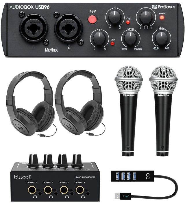 - INCLUDES - PreSonus AudioBox USB 96 2x2 USB Audio Interface 25th Anniversary Edition (Black); Downloadable Studio One Artist & Universal Control. Blucoil 4-Channel Portable Headphone Amplifier with 1/4" & 3.5mm Ports; AC 12V 300mA External Power Adapter. 2-Pack of Samson R21S Cardioid Dynamic Microphones; XLR to 1/4" Microphone Cables; Removable Mic Clips. 2-Pack of Samson SR350 Closed-Back Stereo Headphones. Blucoil USB-A Mini Hub with 1 Micro USB and 4 USB 3.0 Ports.