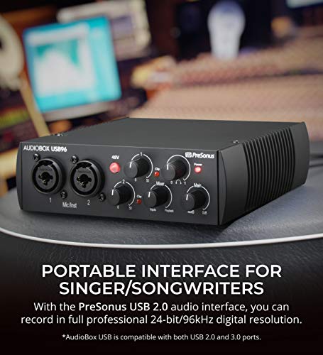 Details: PreSonus AudioBox USB 96 Audio Interface 25th Anniversary EditionThe black PreSonus AudioBox USB 96 offers 2 combo mic/instrument inputs with quiet preamps and +48V phantom power. You can plug in 2 condenser mics and record on 2 separate channels. Each channel has LED clip indicators and 0-35dB mic gain range. This audio interface also provides a Mixer Control knob for blending the input signal with your PC's playback stream. Want more? Don't forget to register your Audiobox USB 96 at PreSonus and get access to the complimentary Studio One Artist DAW!TECHNICAL SPECS:Compatible with: Windows and Mac with Available +8GB RAM, 20GB Disk SpaceA/D Resolution: 24bit/96kHzPreamps: 2 Mic Preamps with +48V Phantom PowerFrequency Range: 20Hz-20kHzDSP/Effects: 20 Native FX Plug-InsGain Control Range: 0-35dBConnectors: XLR-1/4" Input, 1/4" Line Out, 1/4" Phones, USB-BPower Source: USB Bus PowerAccessories: USB Cable; Downloadable Studio One Artist and Universal Control SoftwareAlso Comes With:Blucoil 10-FT Straight Instrument CableThe Blucoil 10-foot instrument cable interconnects your electronic musical instruments (e.g., guitars, bass, keyboards) to a preamp's unbalanced input. It features 1/4" male to 1/4" male straight mono plugs. The metal Neutrik connectors ensure reliable durability and improved contact integrity. The cords are protected with conductive PVC shielding, which cancels out electronic and RF interference.Blucoil 10-FT Balanced XLR CableThe 10-foot Blucoil cable interconnects your microphone to an audio interface, mixer, or preamp. It is made with premium Male-to-Female Neutrik-equivalent Zinc Alloy connectors that are protected with a high-density PVC jacket. The 92% shielding protects your audio signal from EMI/RFI.Get this bundle today and receive Blucoil Pop Filter Windscreen plus 5-Pack of Reusable Velcro Cable Ties!