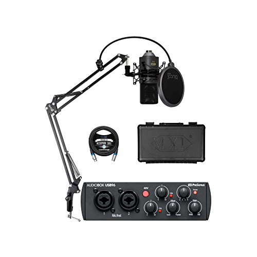 Details: PreSonus AudioBox USB 96 Audio Interface 25th Anniversary EditionThe black PreSonus AudioBox USB 96 offers 2 combo mic/instrument inputs with quiet preamps and +48V phantom power. You can plug in 2 condenser mics and record on 2 separate channels. Each channel has LED clip indicators and 0-35dB mic gain range. This audio interface also provides a Mixer Control knob for blending the input signal with your PC's playback stream. Want more? Don't forget to register your Audiobox USB 96 at PreSonus and get access to the complimentary Studio One Artist DAW!TECHNICAL SPECS:Compatible with: Windows and MacA/D Resolution: 24bit/96kHzPreamps: 2 Mic Preamps with +48V Phantom PowerFrequency Range: 20Hz-20kHzDSP/Effects: 20 Native FX Plug-InsGain Control Range: 0-35dBPower Source: USB Bus PowerAccessories: USB Cable; Downloadable SoftwareAlso Comes With:MXL 770 Condenser MicrophoneThe MXL 770 Microphone features a FET preamp and transformerless balanced output giving a wide 30Hz-20kHz frequency response. It has a 6dB/Octave High-Pass Filter that accurately reproduces solid sounds at low and high frequencies. The cardioid mic has a -10dB Pre-Attenuation Switch, which can handle up to 137dB SPL, perfect for recording vocals, keyboards, and string instruments. NOTE: This mic requires 48V phantom power and includes a shock isolation mount plus carry case.Blucoil Boom Arm Plus Pop FilterThe 30" long Blucoil Boom Arm Pop Filter accommodates all kinds of mics and shock mounts (3/8"-5/8" threading adapter and mic clip are included). It is made of heavy-duty steel, zinc alloyed parts, and can be rotated 360°. The foldable boom arm includes a removable Blucoil Pop Filter that reduces hisses and p-popping. *NOTE: Install the boom arm vertically for it to hold up the weight of a 3.3 lb mic.Get this bundle today and receive a Blucoil 10-FT Balanced XLR Cable!