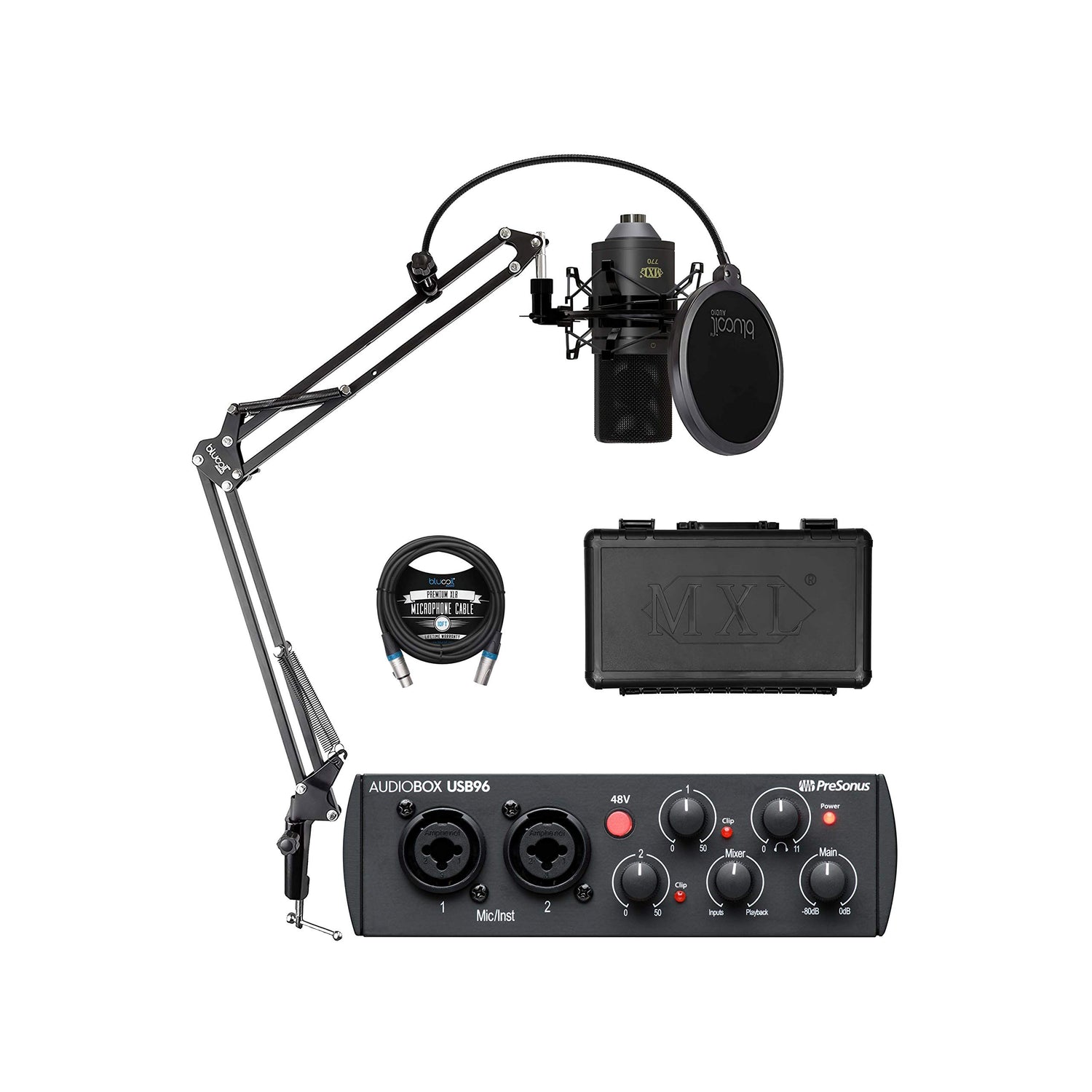 - INCLUDES - PreSonus AudioBox USB 96 2x2 USB Audio Interface with +48V Phantom Power (Black, 25th Anniversary Edition); USB Cable; Downloadable Studio One Artist Software and Universal Control for Windows. MXL 770 Cardioid Condenser Microphone; Shock Isolation Mount; Rugged Carry Case. Blucoil All-in-One Microphone Boom Arm Plus Pop Filter. Blucoil 10-Foot Balanced XLR Cable - Premium Series 3-Pin Cable for Microphones, Speakers, and Pro Devices (Male-to-Female).
