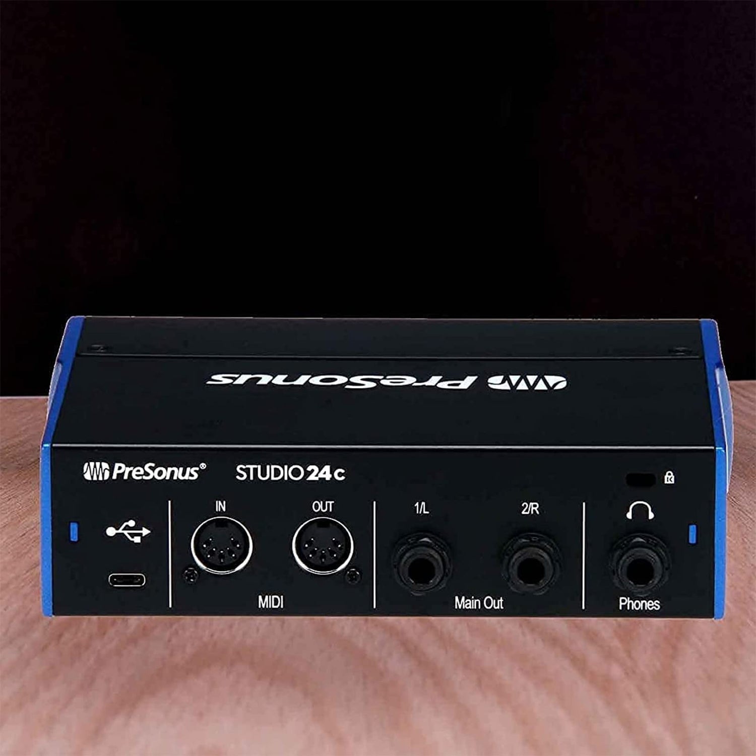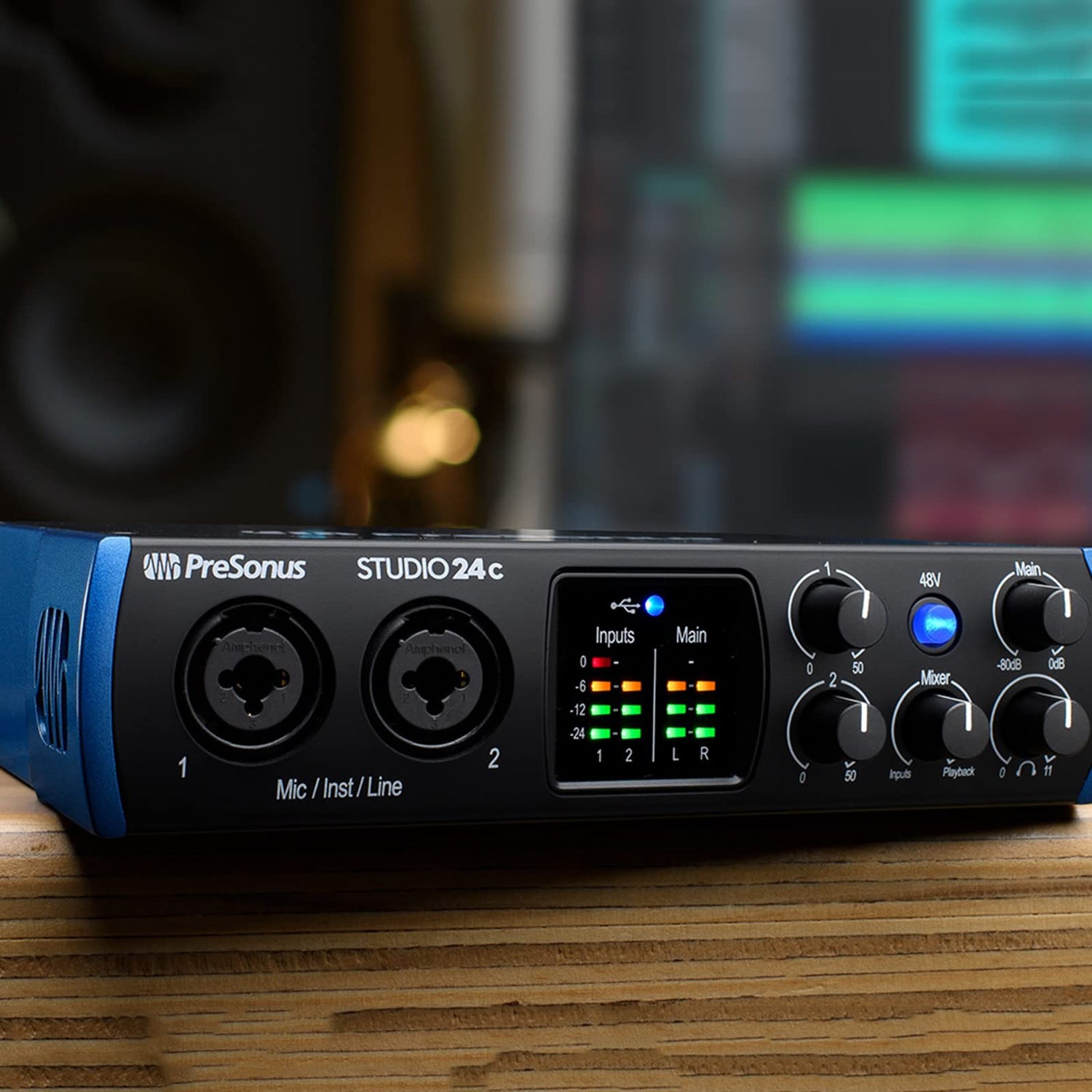 Details: PreSonus Studio 24c USB-C Audio InterfaceThe portable PreSonus Studio 24c is equipped with award-winning XMAX-L mic preamps and delivers up to 24bit/192kHz audio resolution. It comes with Studio One Artist, and Studio Magic Plug-In Suite integrated software, which you can download at PreSonus once you register your new Studio 24C. These programs provide everything you need for audio recording. The extensive plug-in collection is available in AAX, AU, and VST formats.TECHNICAL SPECS:Mic Preamps: 2 XMAX-L with +48V Phantom PowerCompatible with (64bit ONLY): Windows 7, macOS X 10.11, or newer OSA/D Resolution: 24bit/192kHzGain Range: 50dBResponse: 20Hz-20kHzConnectors: 2 XLR-1/4" Mic/Line/Hi-Z In, 2x1/4" Main Out, 1/4" Phones, MIDI In/Out, USB-CPower Source: USB Bus PowerAccessories: USB-C CablesAlso Comes With:MXL 770 Condenser MicrophoneThe MXL 770 Microphone features a FET preamp and transformerless balanced output giving a wide 30Hz-20kHz frequency response. It has a 6dB/Octave High-Pass Filter that accurately reproduces solid sounds at low and high frequencies. The cardioid mic has a -10dB Pre-Attenuation Switch, which can handle up to 137dB SPL, perfect for recording vocals, keyboards, and string instruments. NOTE: This mic requires 48V phantom power and includes a shock isolation mount plus carry case.Blucoil Boom Arm Plus Pop FilterThe 30" long Blucoil Boom Arm Pop Filter accommodates all kinds of mics and shock mounts (3/8" to 5/8" threading adapter and mic clip are included). It is made of heavy-duty steel, zinc alloyed parts, and can be rotated 360°. The foldable boom arm comes with a removable Blucoil Pop Filter, which effectively reduces hisses caused by plosive sounds. NOTE: Install the boom arm vertically for it to hold up the weight of a 3.3 lb mic.Get the Studio 24c Bundle today and receive a Blucoil 10-FT Balanced XLR Cable!