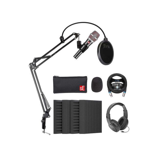 - INCLUDES - sE Electronics V7 Supercardioid Vocal Dynamic Handheld Microphone; Swivel Mic Clip; Thread Adapter; Internal Windscreen; Carrying Pouch. 4-Pack of Blucoil 12-inch Acoustic Foam Isolation Panel Wedges with Adhesive Tapes. Blucoil 10-Foot Balanced XLR Cable - Premium Series 3-Pin Cable for Microphones, Speakers, and Pro Devices (Male-to-Female). Blucoil All-in-One Microphone Boom Arm Plus Pop Filter. Samson SR350 Closed-Back Stereo Headphones.