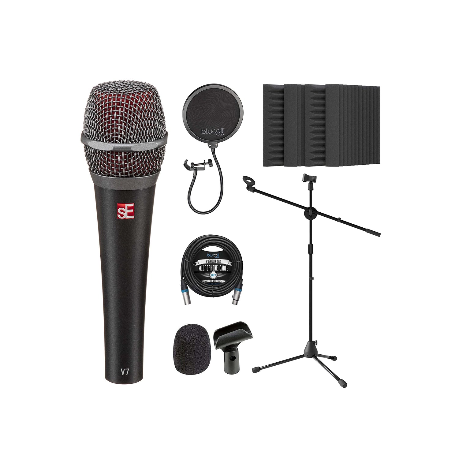 Details: sE Electronics V7 Dynamic MicrophoneThe sE Electronics V7 has a specialized aluminum voice coil that helps produce natural-sounding voice reproduction. Its supercardioid polar pattern ensures isolation from background noise. The all-metal grille features a beveled edge around the steel mesh. This prevents the microphone from rolling away when you place it on a table, amp, or stage floor.TECHNICAL SPECS:Mic Capsule: DynamicPolar Pattern: SupercardioidFreq Response: 40Hz - 19kHzVoice Coil: Aluminum | Magnet: NeodymiumSensitivity: 2.0 mV/Pa (-54dB)Impedance: 300 OhmSize: 2.12" x 7.24"Weight: 0.67 lbAccessories: Swivel Mic Clip; Thread Adapter; Internal Windscreen; Carry PouchAlso Comes With:Blucoil 20-FT Balanced XLR CableThe 20-foot Blucoil cable interconnects your microphone to an audio interface, mixer, or preamp. It is made with premium Male-to-Female Neutrik-equivalent Zinc Alloy connectors that are protected with a high-density PVC jacket. The 92% shielding protects your audio signal from EMI/RFI.Blucoil Adjustable Microphone Tripod StandThe Blucoil Adjustable Microphone Stand features 2.3' to 4.76' height, and 12" long tripod legs. It includes a 2.13' boom arm and 2 mic clips with 3/8" threading. The mic clips have a 2" opening. You also get a 3/8" to 5/8" threading adapter and two cable organizers. The stand can handle up to 11 lb load while the boom arm offers 4.41 lb max weight capacity.Blucoil Acoustic Isolation Wedges (4-Pack)The 12 x 12 x 2-inches Blucoil Acoustic Isolation Panel Wedges absorb high-noise frequencies and echoes in the recording studios. Each panel reduces unwanted noise reflections bouncing off your walls. With 16 adhesive tapes included, the Acoustic Isolation Wedges is an easy and effective acoustical absorption treatment.Get this bundle today and receive a Blucoil Microphone Pop Filter!